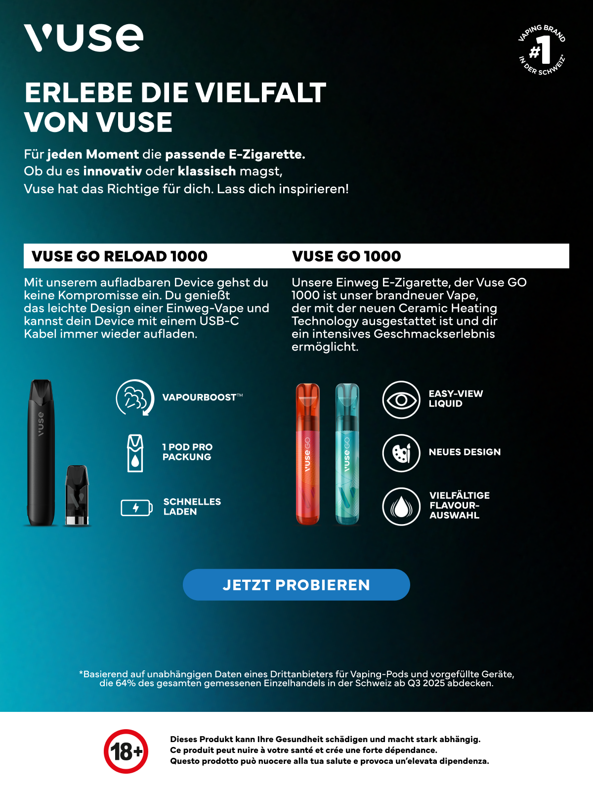 * Basierend auf unabhängigen Daten eines Drittanbieters für Vaping-Pods und vorgefüllte Geräte, die 64% des gesamten gemessenen Einzelhandels in der Schweiz ab Q3 2025 abdecken.